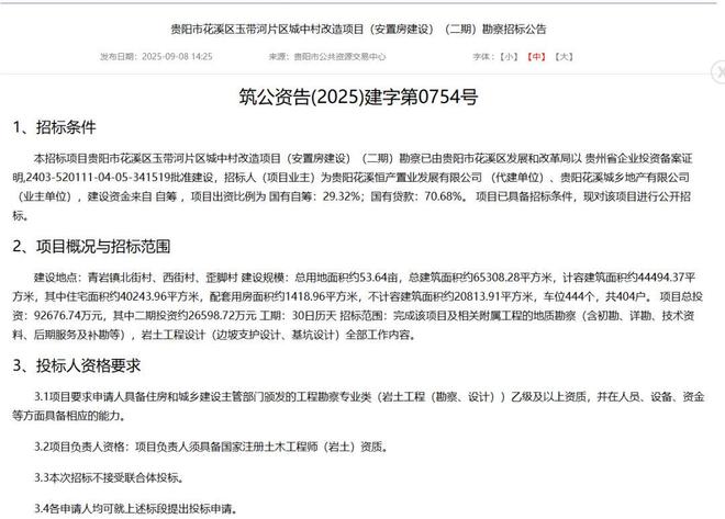 贵阳市公共资源交易中心最新发布的《花溪区玉带河片区城中村改造安置房建设(二期)勘察招标公告》显示,该项目已正式进入地质勘察阶段。