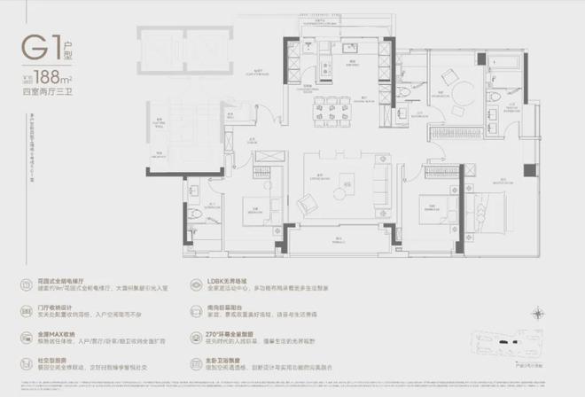 188户型2梯2户,有独立的电梯厅。4房3卫设计,还是3明卫,这两点还是不错的。